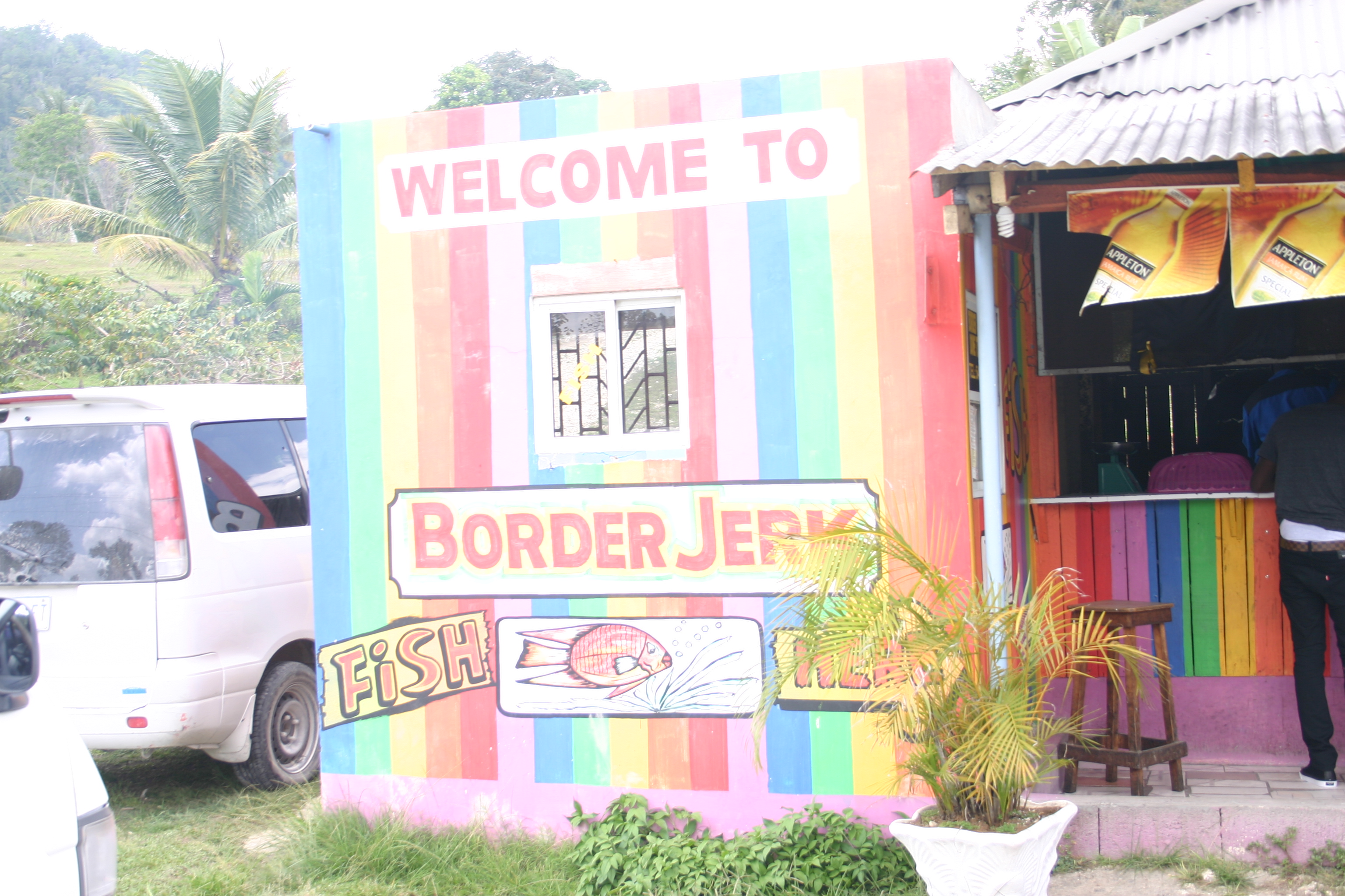 We began the day with plans to go to an orphanage but we found out that that trip needed to be postponed until tomorrow. So, we decided to head up to McField early, where the Bible College is, and have lunch at “Border Jerk.” This is a place where they make jerk chicken and pork. It was awesome! Here’s a couple of photos of the place and what we ate: