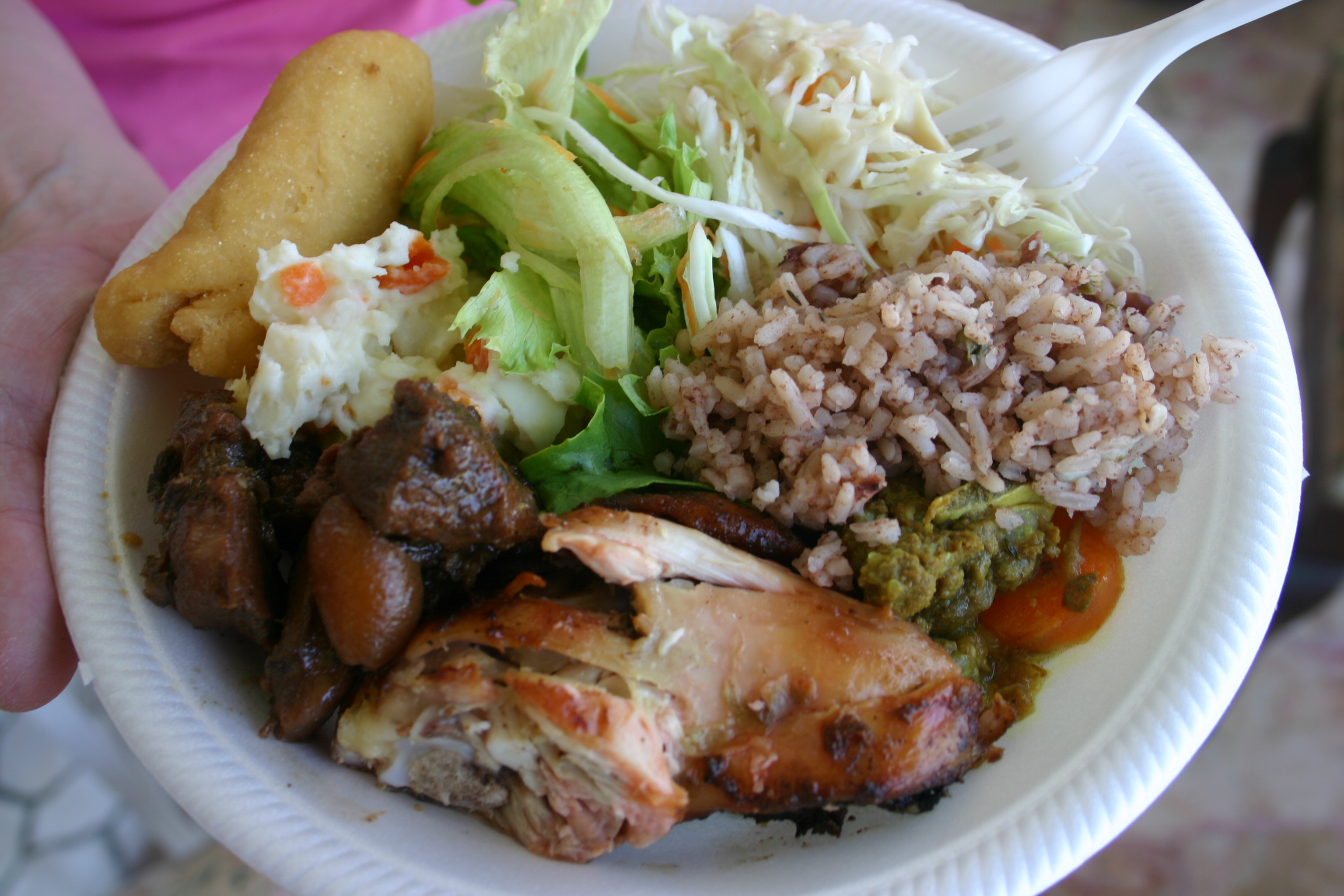 After that, the main meal was served buffet style. It consisted of jerk chicken, curry goat and some really, really good pork. Here’s a pic of my plate: